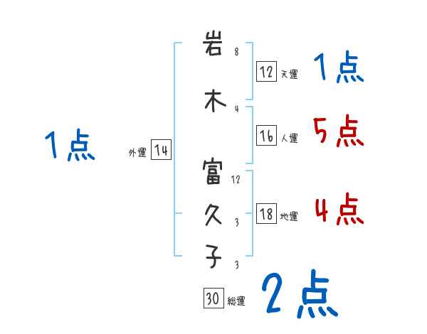 外運![]() | 岩木富久子さんの外運は14画の1つ星!人に対して優しいがストレスを溜め込みがち。人間関係のトラブルを避けるよう気をつけましょう。 生活面を象徴する運勢です。外部から受ける影響力を表し、結婚運、家庭運や職場、環境への順応性を表します。 |