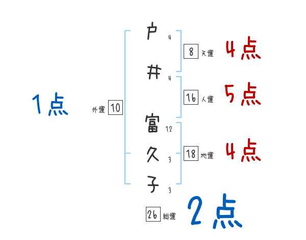 人運![]() | 戸井富久子さんの人運は16画の5つ星!人望が厚く大きく発展する。逆転成功が見える。 性格や才能などを表す2番目に重要な運勢です。人間関係や協調性、社会的な成功に影響します。主に20歳から50歳ぐらいまでの中年期の運勢を表します。 |