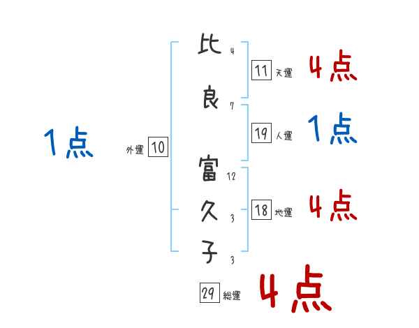 天運![]() | 比良富久子さんの天運は11画の4つ星!着実に富や地位を得る幸運な人生。 家系が持つ宿命的な運勢を表します。祖先から受け継いだ苗字ですので自分の力が及びません。家柄を象徴します。 |