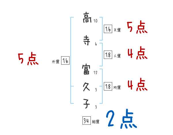 外運![]() | 高寺富久子さんの外運は16画の5つ星!人望が厚く大きく発展する。逆転成功が見える。 生活面を象徴する運勢です。外部から受ける影響力を表し、結婚運、家庭運や職場、環境への順応性を表します。 |