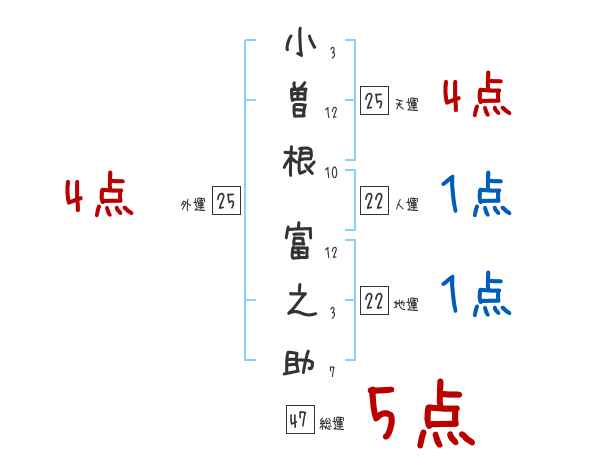総運![]() | 小曽根富之助さんの総運は47画の5つ星!実力が開花し発展する円満な人生。財に恵まれる。 あなたの人生を表す1番重要な運勢です。生涯を通じて影響する総合運となり、主に50歳以降の晩年期に影響を及ぼします。 |