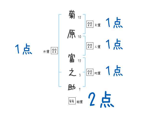 外運![]() | 菊原富之助さんの外運は22画の1つ星!努力することが苦手ないっぽう手先が器用。芸術性にも優れる。 生活面を象徴する運勢です。外部から受ける影響力を表し、結婚運、家庭運や職場、環境への順応性を表します。 |