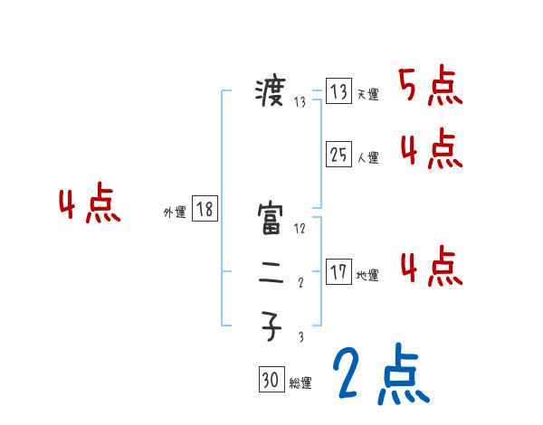 天運![]() | 渡富二子さんの天運は13画の5つ星!才能に恵まれ人気がある。名声を手に入れる。円満な人生。 家系が持つ宿命的な運勢を表します。祖先から受け継いだ苗字ですので自分の力が及びません。家柄を象徴します。 |