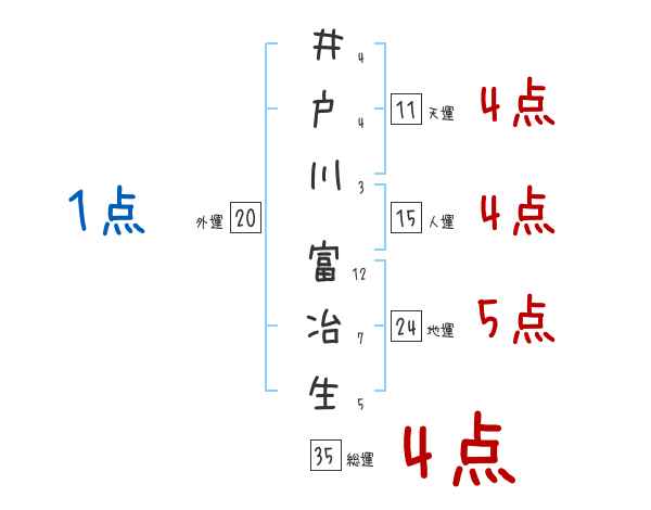 天運![]() | 井戸川富冶生さんの天運は11画の4つ星!着実に富や地位を得る幸運な人生。 家系が持つ宿命的な運勢を表します。祖先から受け継いだ苗字ですので自分の力が及びません。家柄を象徴します。 |