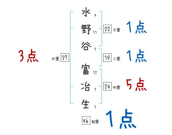 総運![]() | 水野谷富冶生さんの総運は46画の1つ星!迷走することが多く苦労するかも。目先のことにとらわれないように。 あなたの人生を表す1番重要な運勢です。生涯を通じて影響する総合運となり、主に50歳以降の晩年期に影響を及ぼします。 |