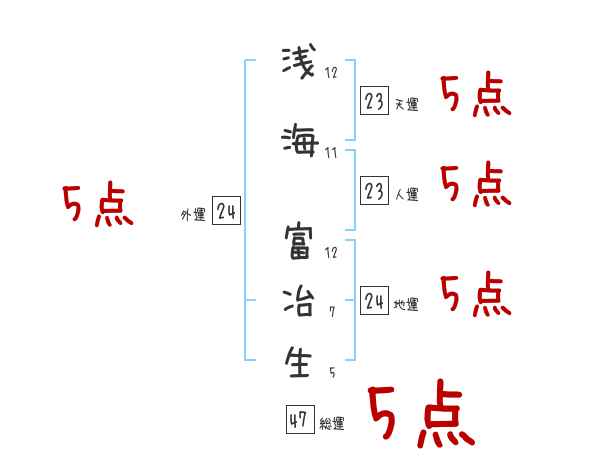 外運![]() | 浅海富冶生さんの外運は24画の5つ星!家庭運が良く順調な人生。金運にも恵まれる。 生活面を象徴する運勢です。外部から受ける影響力を表し、結婚運、家庭運や職場、環境への順応性を表します。 |