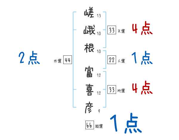 天運![]() | 嵯峨根富喜彦さんの天運は33画の4つ星!権力志向でプライドが高い。勇気があり運を切り開き成功する。 家系が持つ宿命的な運勢を表します。祖先から受け継いだ苗字ですので自分の力が及びません。家柄を象徴します。 |
