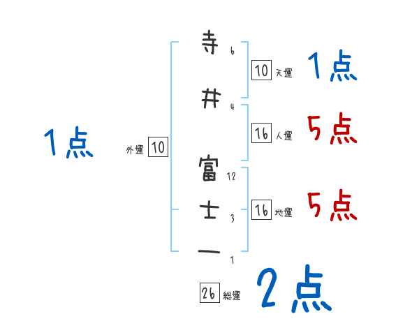 天運![]() | 寺井富士一さんの天運は10画の1つ星!不安を感じやすい傾向。ストレスを抱えないように注意しましょう。 家系が持つ宿命的な運勢を表します。祖先から受け継いだ苗字ですので自分の力が及びません。家柄を象徴します。 |