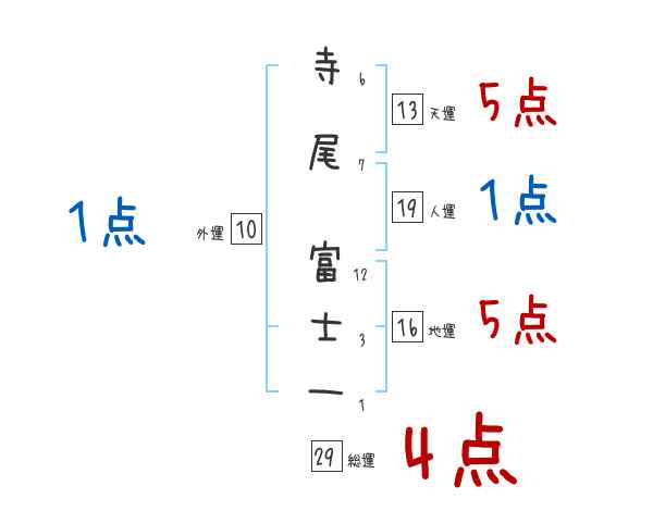 天運![]() | 寺尾富士一さんの天運は13画の5つ星!才能に恵まれ人気がある。名声を手に入れる。円満な人生。 家系が持つ宿命的な運勢を表します。祖先から受け継いだ苗字ですので自分の力が及びません。家柄を象徴します。 |