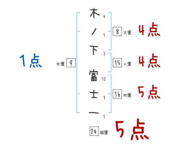 天運![]() | 木ノ下富士一さんの天運は8画の4つ星!勤勉家。根気強く努力し成功する。忍耐力がある。 家系が持つ宿命的な運勢を表します。祖先から受け継いだ苗字ですので自分の力が及びません。家柄を象徴します。 |
