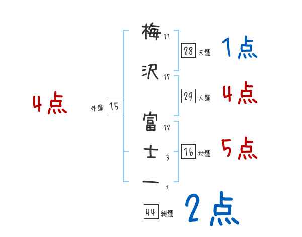 | 天運  | 梅沢富士一さんの天運は28画の1つ星!家庭環境に注意。スポーツで活躍できる能力があるかも。家系が持つ宿命的な運勢を表します。祖先から受け継いだ苗字ですので自分の力が及びません。家柄を象徴します。 |