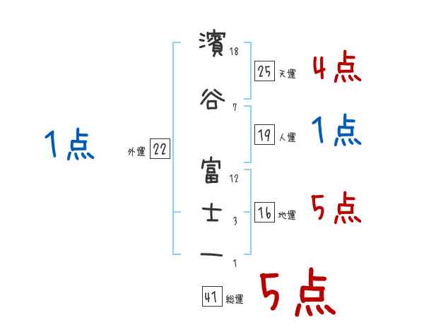 | 天運  | 濱谷富士一さんの天運は25画の4つ星!個性があり才能があふれる。強運の持ち主で発展する。家系が持つ宿命的な運勢を表します。祖先から受け継いだ苗字ですので自分の力が及びません。家柄を象徴します。 |