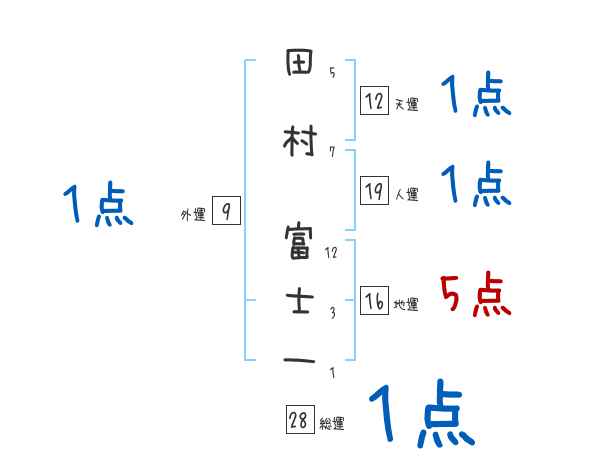 総運![]() | 田村富士一さんの総運は28画の1つ星!家庭環境に注意。スポーツで活躍できる能力があるかも。 あなたの人生を表す1番重要な運勢です。生涯を通じて影響する総合運となり、主に50歳以降の晩年期に影響を及ぼします。 |