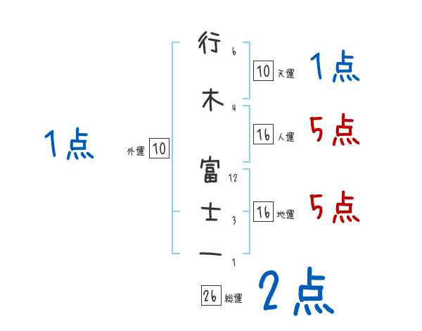 人運![]() | 行木富士一さんの人運は16画の5つ星!人望が厚く大きく発展する。逆転成功が見える。 性格や才能などを表す2番目に重要な運勢です。人間関係や協調性、社会的な成功に影響します。主に20歳から50歳ぐらいまでの中年期の運勢を表します。 |