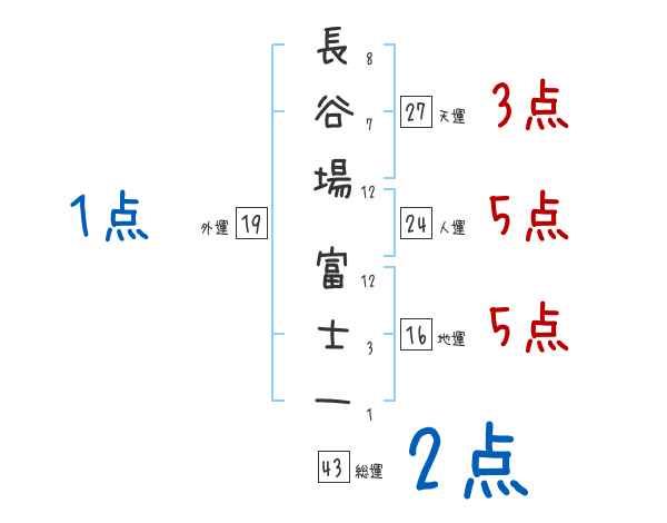 地運![]() | 長谷場富士一さんの地運は16画の5つ星!人望が厚く大きく発展する。逆転成功が見える。 個性を表す基礎的な運勢です。性格形成や対人関係、行動力など家庭環境に影響されます。主に誕生してから20歳くらいまでの若年期の運勢を表します。 |
