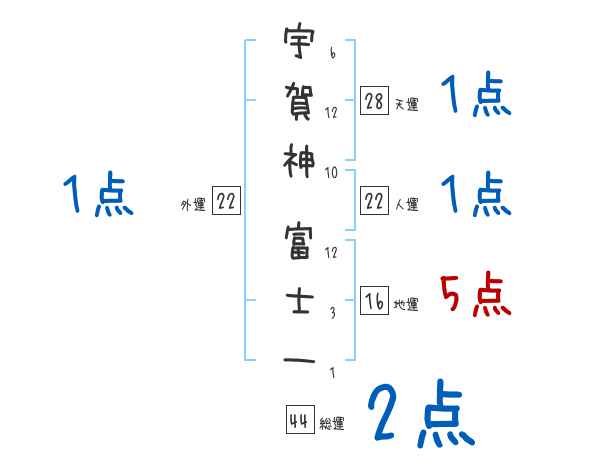 | 外運  | 宇賀神富士一さんの外運は22画の1つ星!努力することが苦手ないっぽう手先が器用。芸術性にも優れる。生活面を象徴する運勢です。外部から受ける影響力を表し、結婚運、家庭運や職場、環境への順応性を表します。 |