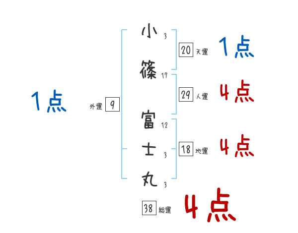 人運![]() | 小篠富士丸さんの人運は29画の4つ星!完全主義で才能がある。厳格な心の持ち主。 性格や才能などを表す2番目に重要な運勢です。人間関係や協調性、社会的な成功に影響します。主に20歳から50歳ぐらいまでの中年期の運勢を表します。 |