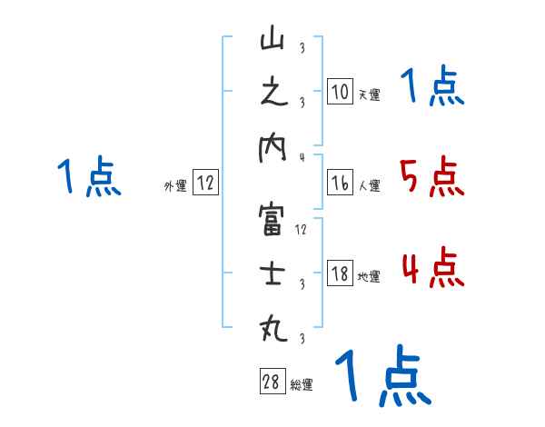 天運![]() | 山之内富士丸さんの天運は10画の1つ星!不安を感じやすい傾向。ストレスを抱えないように注意しましょう。 家系が持つ宿命的な運勢を表します。祖先から受け継いだ苗字ですので自分の力が及びません。家柄を象徴します。 |
