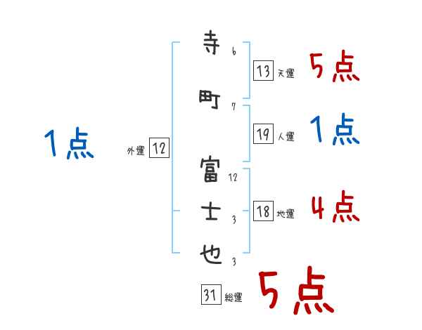天運![]() | 寺町富士也さんの天運は13画の5つ星!才能に恵まれ人気がある。名声を手に入れる。円満な人生。 家系が持つ宿命的な運勢を表します。祖先から受け継いだ苗字ですので自分の力が及びません。家柄を象徴します。 |