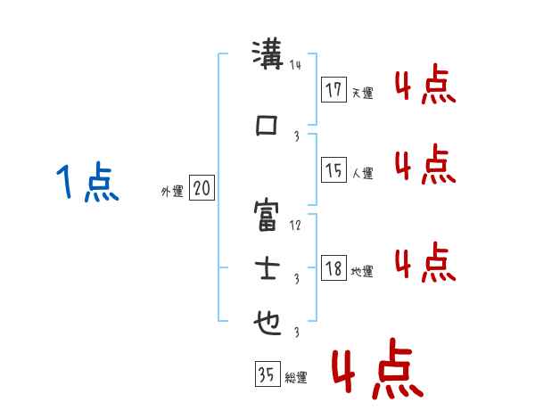 天運![]() | 溝口富士也さんの天運は17画の4つ星!積極的な行動力。地位を気づき財産を手に入れる。純粋な心と直感力。 家系が持つ宿命的な運勢を表します。祖先から受け継いだ苗字ですので自分の力が及びません。家柄を象徴します。 |