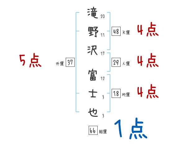 天運![]() | 滝野沢富士也さんの天運は48画の4つ星!賢明な性格で人望が厚い。指導力があり多くの人に尊敬される。 家系が持つ宿命的な運勢を表します。祖先から受け継いだ苗字ですので自分の力が及びません。家柄を象徴します。 |