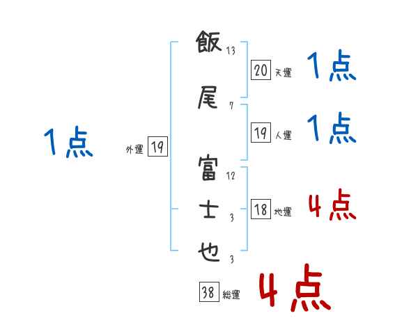 外運![]() | 飯尾富士也さんの外運は19画の1つ星!優れた才能を持ちますが、協調性が足りないことも。周りの人と協力する事を意識しましょう。 生活面を象徴する運勢です。外部から受ける影響力を表し、結婚運、家庭運や職場、環境への順応性を表します。 |