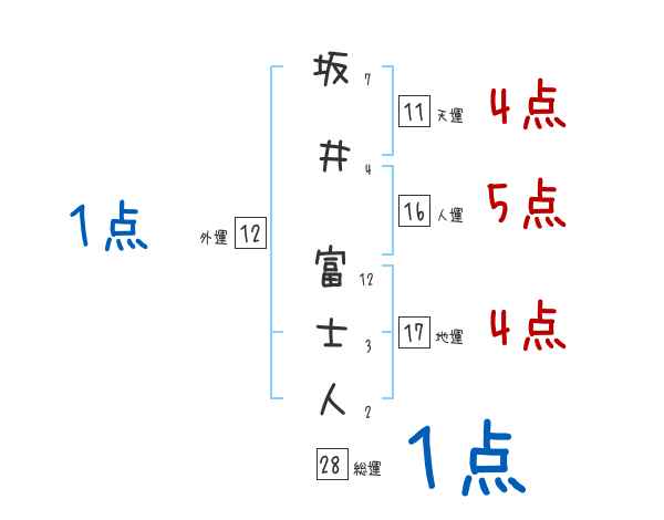 天運![]() | 坂井富士人さんの天運は11画の4つ星!着実に富や地位を得る幸運な人生。 家系が持つ宿命的な運勢を表します。祖先から受け継いだ苗字ですので自分の力が及びません。家柄を象徴します。 |