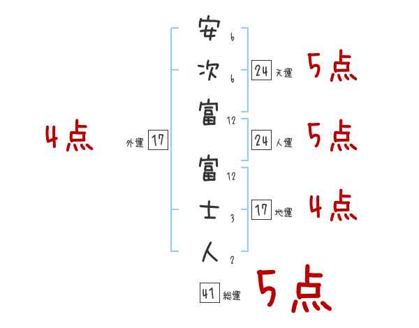 外運![]() | 安次富富士人さんの外運は17画の4つ星!積極的な行動力。地位を気づき財産を手に入れる。純粋な心と直感力。 生活面を象徴する運勢です。外部から受ける影響力を表し、結婚運、家庭運や職場、環境への順応性を表します。 |
