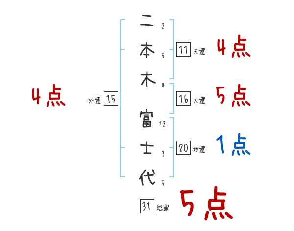 人運![]() | 二本木富士代さんの人運は16画の5つ星!人望が厚く大きく発展する。逆転成功が見える。 性格や才能などを表す2番目に重要な運勢です。人間関係や協調性、社会的な成功に影響します。主に20歳から50歳ぐらいまでの中年期の運勢を表します。 |