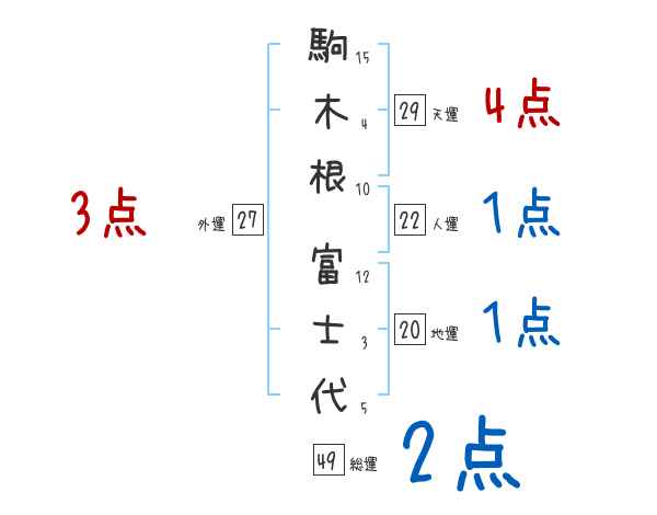 天運![]() | 駒木根富士代さんの天運は29画の4つ星!完全主義で才能がある。厳格な心の持ち主。 家系が持つ宿命的な運勢を表します。祖先から受け継いだ苗字ですので自分の力が及びません。家柄を象徴します。 |