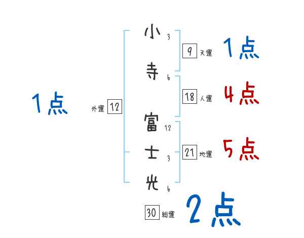 天運![]() | 小寺富士光さんの天運は9画の1つ星!消極的で才能を発揮することが苦手なことも。周りの意見に耳を傾けましょう。 家系が持つ宿命的な運勢を表します。祖先から受け継いだ苗字ですので自分の力が及びません。家柄を象徴します。 |