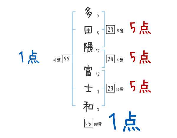 天運![]() | 多田隈富士和さんの天運は23画の5つ星!想像力に優れ活力がある。一代で成功し名誉を手に入れる。 家系が持つ宿命的な運勢を表します。祖先から受け継いだ苗字ですので自分の力が及びません。家柄を象徴します。 |