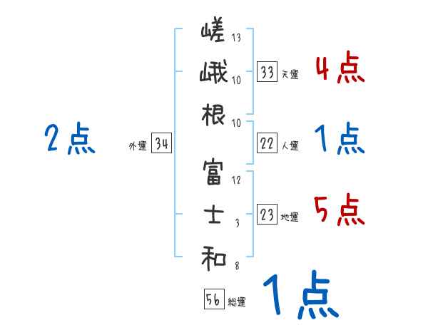 天運![]() | 嵯峨根富士和さんの天運は33画の4つ星!権力志向でプライドが高い。勇気があり運を切り開き成功する。 家系が持つ宿命的な運勢を表します。祖先から受け継いだ苗字ですので自分の力が及びません。家柄を象徴します。 |