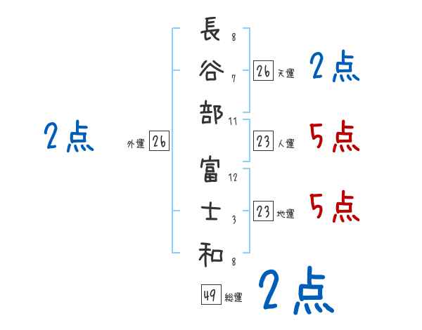 天運![]() | 長谷部富士和さんの天運は26画の2つ星!波瀾万丈かも。信頼できる人を大事にしましょう。 家系が持つ宿命的な運勢を表します。祖先から受け継いだ苗字ですので自分の力が及びません。家柄を象徴します。 |