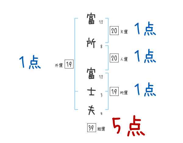 外運![]() | 富所富士夫さんの外運は19画の1つ星!優れた才能を持ちますが、協調性が足りないことも。周りの人と協力する事を意識しましょう。 生活面を象徴する運勢です。外部から受ける影響力を表し、結婚運、家庭運や職場、環境への順応性を表します。 |