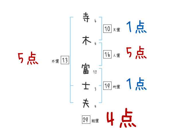 人運![]() | 寺木富士夫さんの人運は16画の5つ星!人望が厚く大きく発展する。逆転成功が見える。 性格や才能などを表す2番目に重要な運勢です。人間関係や協調性、社会的な成功に影響します。主に20歳から50歳ぐらいまでの中年期の運勢を表します。 |