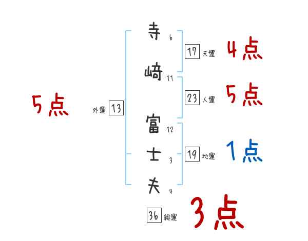 総運![]() | 寺﨑富士夫さんの総運は36画の3つ星!先見性が豊かです。多少神経質で苦労することも。 あなたの人生を表す1番重要な運勢です。生涯を通じて影響する総合運となり、主に50歳以降の晩年期に影響を及ぼします。 |