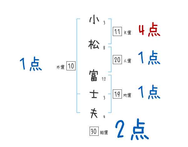 総運![]() | 小松富士夫さんの総運は30画の2つ星!浮き沈みの激しさに注意しましょう。 あなたの人生を表す1番重要な運勢です。生涯を通じて影響する総合運となり、主に50歳以降の晩年期に影響を及ぼします。 |