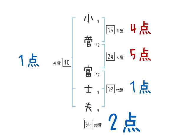 天運![]() | 小菅富士夫さんの天運は15画の4つ星!人徳があり出世する。順調に物事を進め円満な人生。 家系が持つ宿命的な運勢を表します。祖先から受け継いだ苗字ですので自分の力が及びません。家柄を象徴します。 |