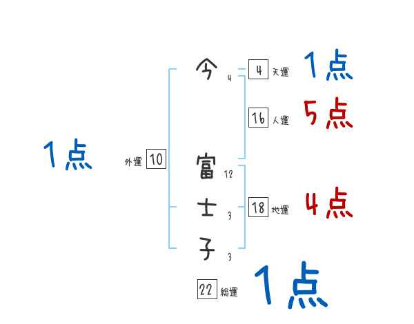 天運![]() | 今富士子さんの天運は4画の1つ星!感情が不安定で苦労するかも。周囲との協調を心掛けましょう。 家系が持つ宿命的な運勢を表します。祖先から受け継いだ苗字ですので自分の力が及びません。家柄を象徴します。 |