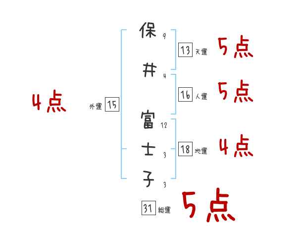 人運![]() | 保井富士子さんの人運は16画の5つ星!人望が厚く大きく発展する。逆転成功が見える。 性格や才能などを表す2番目に重要な運勢です。人間関係や協調性、社会的な成功に影響します。主に20歳から50歳ぐらいまでの中年期の運勢を表します。 |