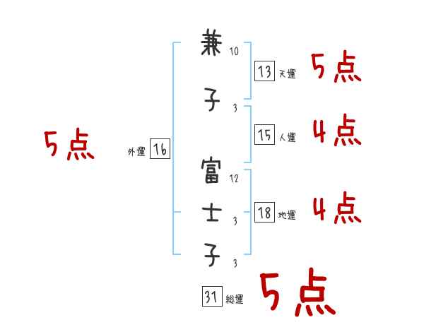 外運![]() | 兼子富士子さんの外運は16画の5つ星!人望が厚く大きく発展する。逆転成功が見える。 生活面を象徴する運勢です。外部から受ける影響力を表し、結婚運、家庭運や職場、環境への順応性を表します。 |