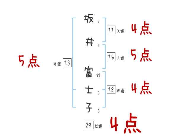 天運![]() | 坂井富士子さんの天運は11画の4つ星!着実に富や地位を得る幸運な人生。 家系が持つ宿命的な運勢を表します。祖先から受け継いだ苗字ですので自分の力が及びません。家柄を象徴します。 |