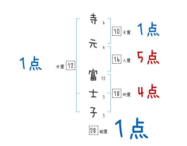 人運![]() | 寺元富士子さんの人運は16画の5つ星!人望が厚く大きく発展する。逆転成功が見える。 性格や才能などを表す2番目に重要な運勢です。人間関係や協調性、社会的な成功に影響します。主に20歳から50歳ぐらいまでの中年期の運勢を表します。 |