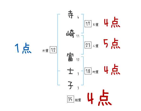 人運![]() | 寺崎富士子さんの人運は23画の5つ星!想像力に優れ活力がある。一代で成功し名誉を手に入れる。 性格や才能などを表す2番目に重要な運勢です。人間関係や協調性、社会的な成功に影響します。主に20歳から50歳ぐらいまでの中年期の運勢を表します。 |