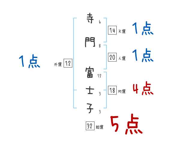 総運![]() | 寺門富士子さんの総運は32画の5つ星!柔軟性があり成功する。チャンスが多く金運が良い。 あなたの人生を表す1番重要な運勢です。生涯を通じて影響する総合運となり、主に50歳以降の晩年期に影響を及ぼします。 |