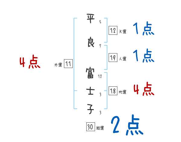 総運![]() | 平良富士子さんの総運は30画の2つ星!浮き沈みの激しさに注意しましょう。 あなたの人生を表す1番重要な運勢です。生涯を通じて影響する総合運となり、主に50歳以降の晩年期に影響を及ぼします。 |