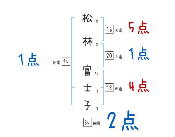 外運![]() | 松林富士子さんの外運は14画の1つ星!人に対して優しいがストレスを溜め込みがち。人間関係のトラブルを避けるよう気をつけましょう。 生活面を象徴する運勢です。外部から受ける影響力を表し、結婚運、家庭運や職場、環境への順応性を表します。 |