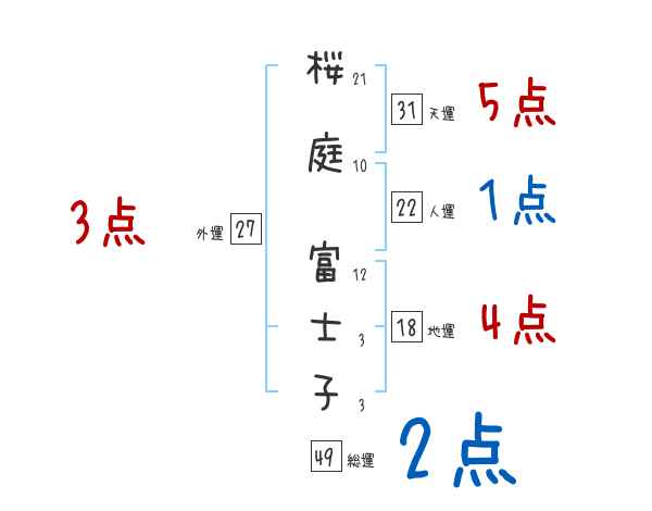 外運![]() | 桜庭富士子さんの外運は27画の3つ星!頭脳明晰だが強情で摩擦が多い傾向。孤立に注意。 生活面を象徴する運勢です。外部から受ける影響力を表し、結婚運、家庭運や職場、環境への順応性を表します。 |
