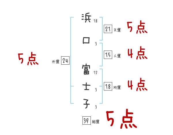 外運![]() | 浜口富士子さんの外運は24画の5つ星!家庭運が良く順調な人生。金運にも恵まれる。 生活面を象徴する運勢です。外部から受ける影響力を表し、結婚運、家庭運や職場、環境への順応性を表します。 |